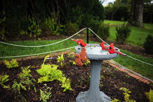 In a serene garden setting, a birdbath is adorned with vibrant, blocky sculptures of cardinals and an orange-brown bird, crafted from colorful materials. The playful composition merges art and nature, surrounded by lush greenery that hints at a tranquil atmosphere. Soft, diffused lighting enhances the vivid colors while creating gentle shadows, evoking a sense of whimsy and delight in this outdoor display.