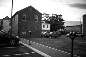 In this monochromatic photograph, a quiet parking lot unfolds beneath a gently fading sky, where the shadows of a brick building loom large. The composition captures an isolated moment, evoking a sense of stillness and solitude in an urban setting, with muted light adding to the contemplative mood. The parking meter stands as a solitary sentinel amid parked vehicles, hinting at the mundane yet intimate stories held within this space.