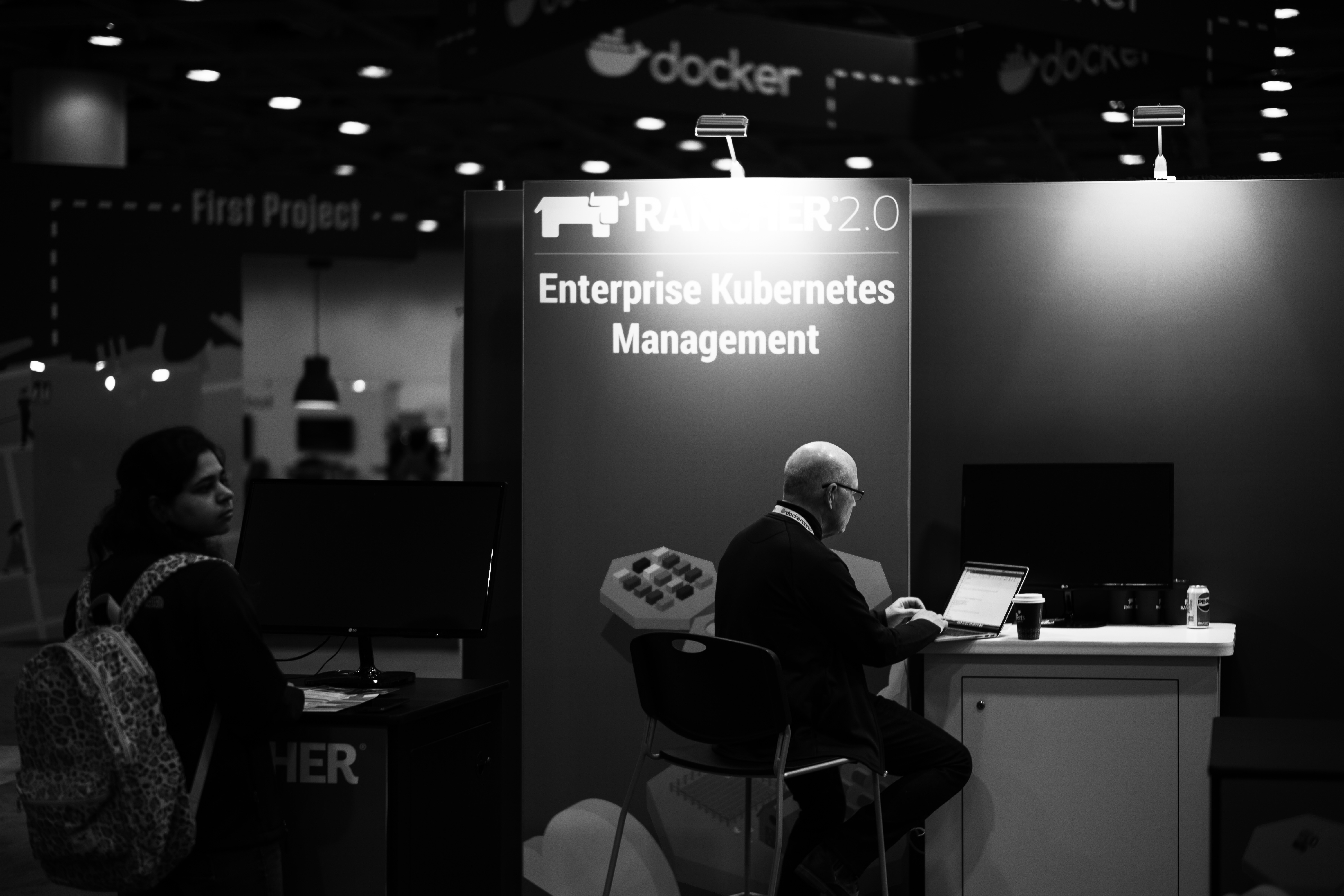 In a dimly lit expo hall, a solitary figure is immersed in technology, seated at a booth dedicated to enterprise Kubernetes management. The stark contrast between deep shadows and the bright signage creates a contemplative mood, emphasizing the individual’s concentration amidst a bustling backdrop. The monochromatic palette not only enhances the scene's solemnity but also invites reflection on the intersection of technology and human interaction.