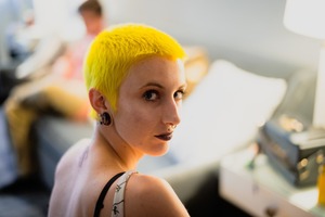 A striking portrait of a young woman with vibrant yellow hair captures her introspective expression. The soft, warm lighting enhances her delicate features and the serene yet edgy atmosphere of the scene. Behind her, a softly blurred background adds depth, emphasizing her captivating gaze and unique style.