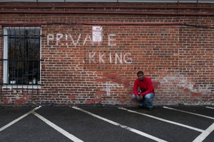 In an industrial setting, a man in a striking red shirt crouches by a textured brick wall, enhancing the mood of urban isolation. The washed-out light underscores a sense of quiet contemplation, while the faded graffiti hints at past stories. The composition contrasts his figure against the stern lines of the parking spaces, emphasizing his solitude in the bustling city.