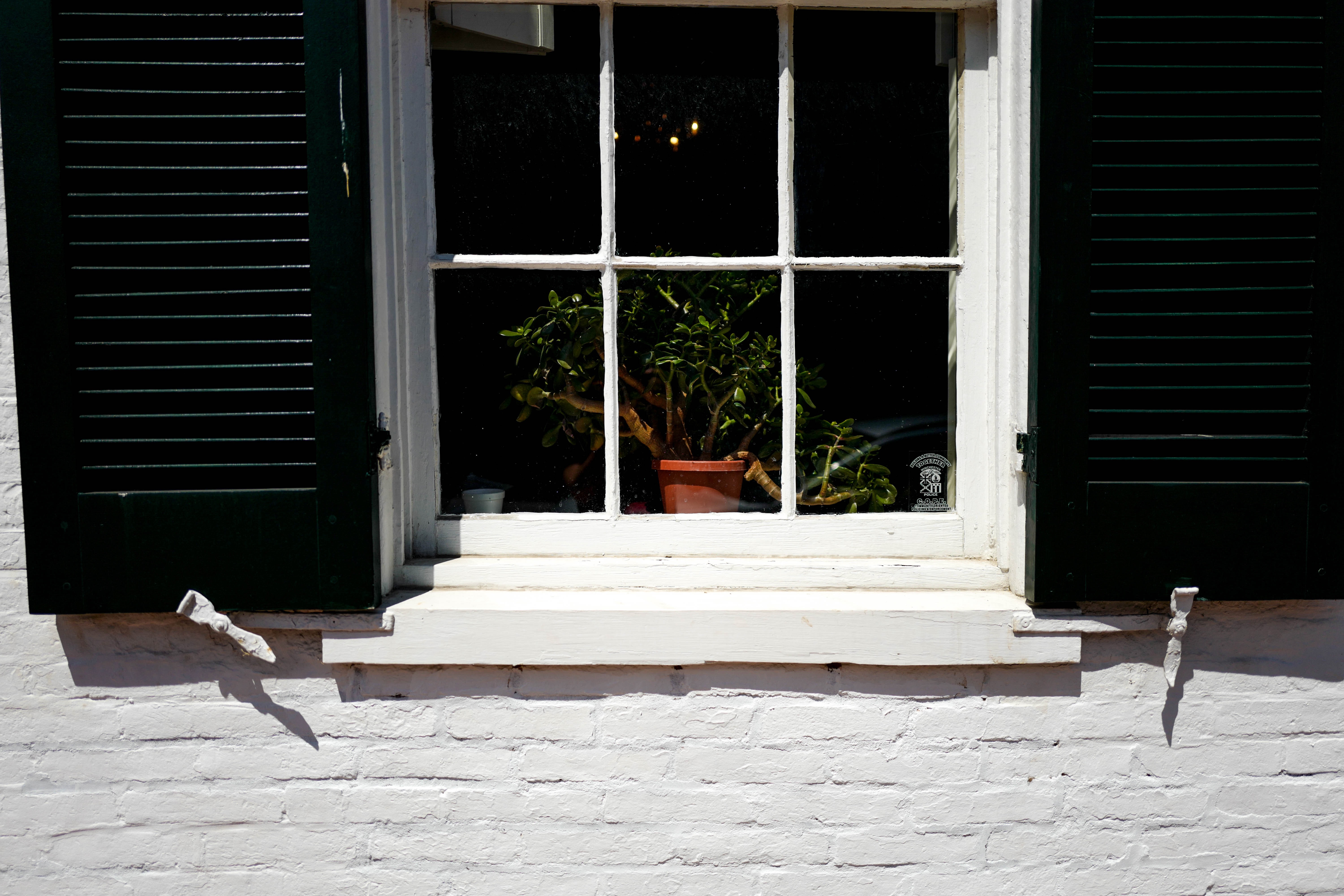 A charming window framed by deep green shutters reveals a lush potted plant, hinting at the life within. The warm sunlight bathes the scene, creating a serene and inviting atmosphere. The contrasting colors of the white brick and the dark shutters add depth, emphasizing the simplicity and beauty of everyday moments.