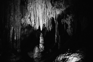 In this striking black and white photograph, stalactites hang dramatically from the cave ceiling, their jagged shapes creating a sense of looming presence. A solitary column of rock stands illuminated in a soft beam of light, casting an ethereal glow that highlights the textures and contours around it. The overall mood is one of mystery and intrigue, inviting the viewer to explore the depths of this ancient subterranean world.