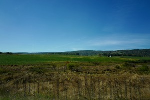 This photograph captures a sprawling countryside under a clear blue sky, with gentle hills rolling in the background. The composition features vibrant green fields contrasted by dry grasses in the foreground, evoking a sense of tranquility and the subtle transition of seasons. Soft natural light enhances the colors, creating a peaceful and inviting atmosphere reminiscent of a quiet autumn day.