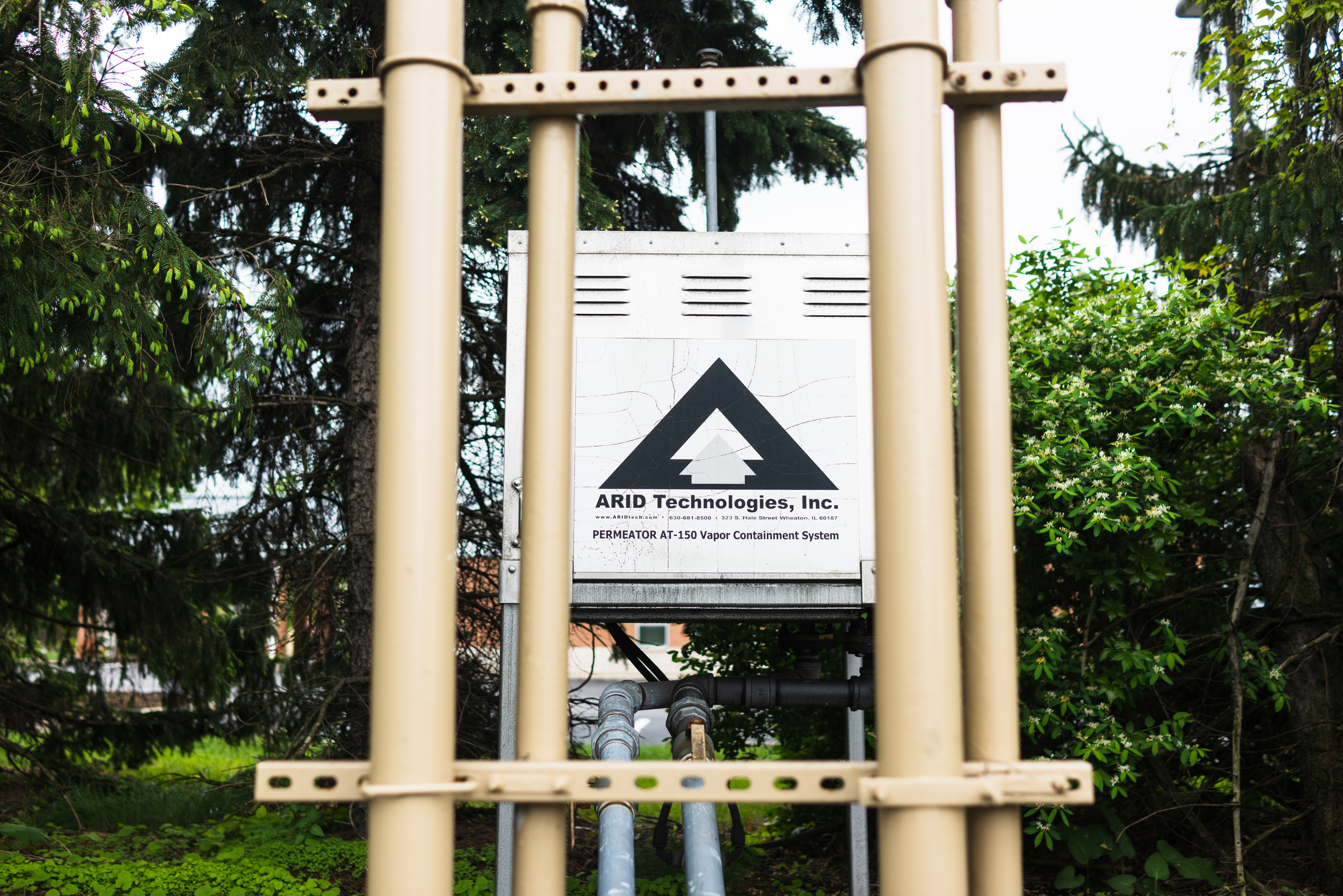The photograph captures an industrial unit branded 'ARID Technologies, Inc.' framed by metal poles and surrounding lush greenery. The contrast between the mechanical structure and the natural elements evokes a sense of coexistence, while the overcast lighting lends a subdued, contemplative mood. The composition draws the eye to the logo, emphasizing the blend of technology amidst nature.