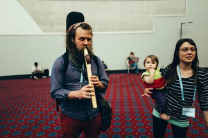 In a vibrant indoor space, a bearded man plays a wooden flute, embodying a sense of peace and creativity. He stands beside a woman holding a young child, whose curious expression adds warmth to the scene. The colorful carpet and casual atmosphere contrast with the focused moment of music, creating a lively yet intimate environment.