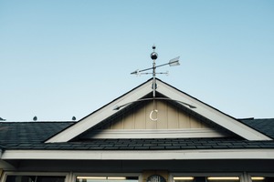 This photograph captures a weather vane atop a gabled roof, symbolizing direction and change. The clear blue sky acts as a serene backdrop, enhancing the tranquil mood of the scene. The composition focuses on the intricate details of the vane, evoking a sense of stability amidst the vastness above.