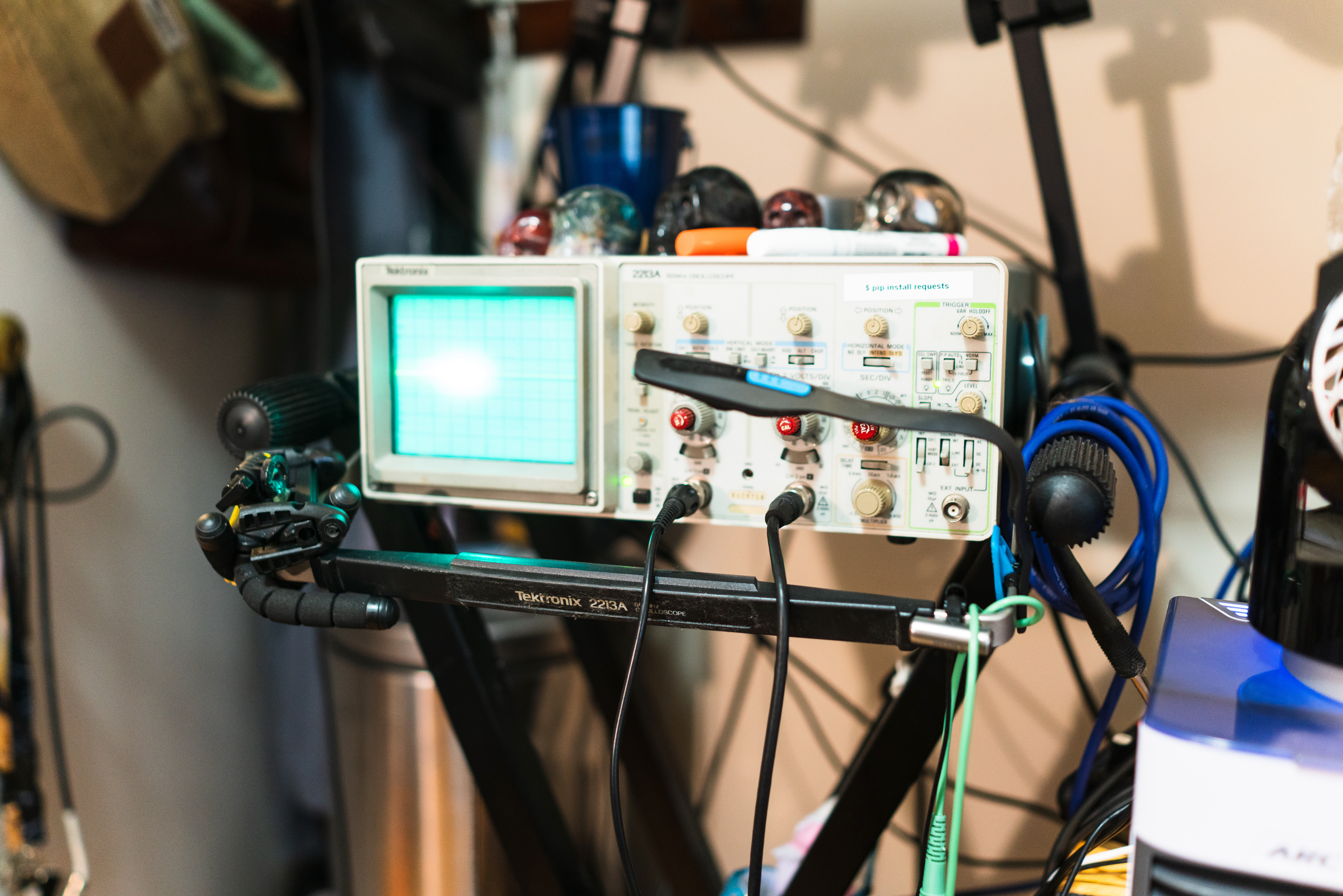 This photograph captures a vintage oscilloscope amidst a cluttered workspace, evoking a sense of creativity and experimentation. The cool light from the screen contrasts with the warm tones of the background, suggesting a blend of nostalgia and modern ingenuity. The chaotic arrangement of tools and objects enhances the mood of a working environment brimming with potential and innovation.