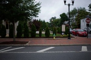 This photograph captures a serene street corner, framed by neatly trimmed hedges and a bright green fire hydrant, contrasting with the muted tones of an overcast sky. The composition balances natural elements and human-made structures, evoking a calm, almost reflective mood. Soft lighting enhances the subtle details of the scene, creating a sense of tranquility in an urban setting.