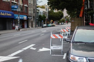 The photograph captures a quiet street scene, with selective focus on the foreground barrier blocking traffic, suggesting an air of abandonment. Soft, diffused lighting enhances the serene yet somewhat melancholic atmosphere, while empty storefronts and a solitary car hint at a pause in urban life. The stark contrast between the white barriers and the blurred background adds to the sense of isolation.