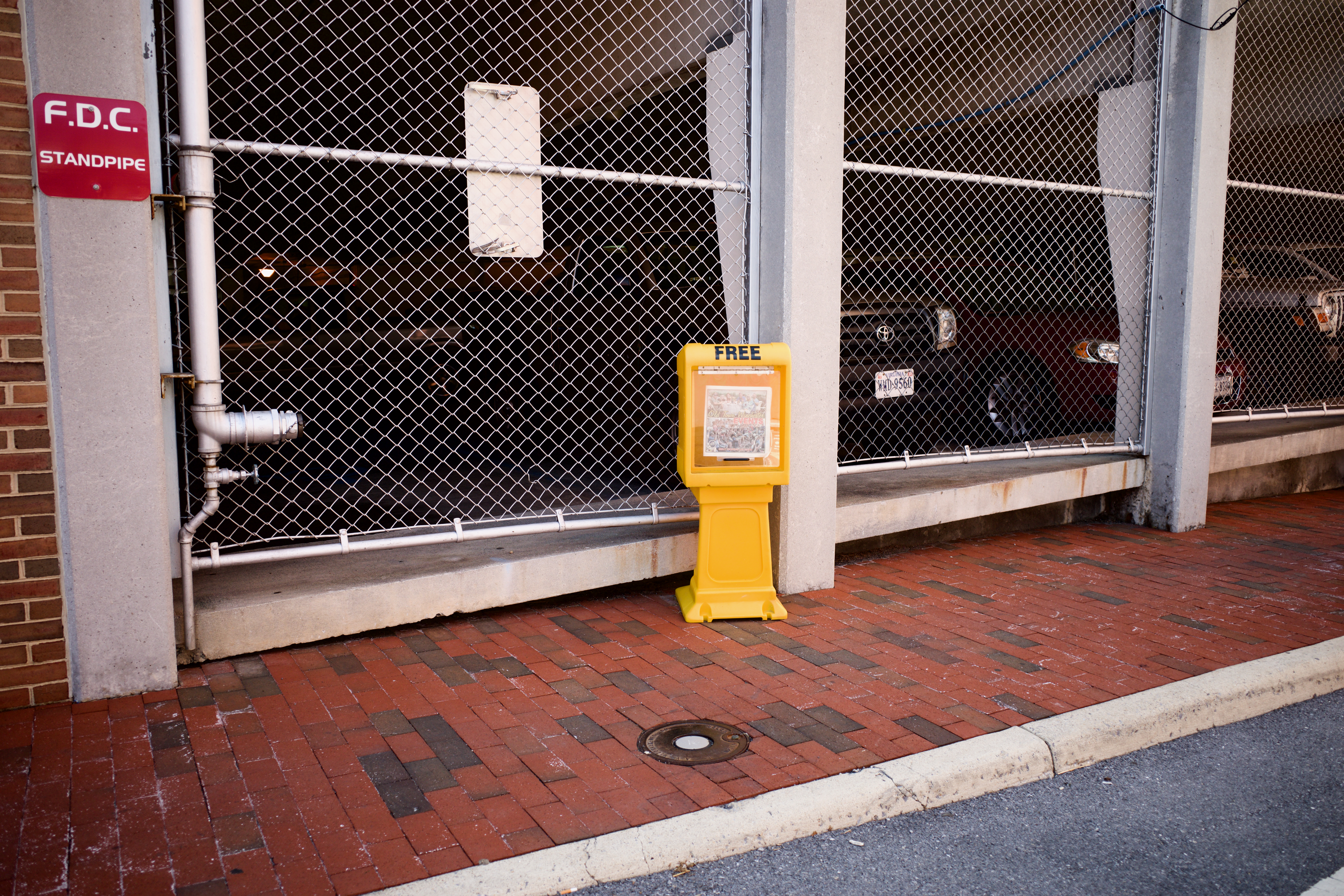 A vibrant yellow newsstand stands alone against muted tones of a grayed-out parking structure. The contrast between the bright object and the dim surroundings evokes a sense of isolation and urban stillness, while the tightly composed framing hints at confinement. Soft natural light casts gentle shadows, emphasizing the starkness of the scene.