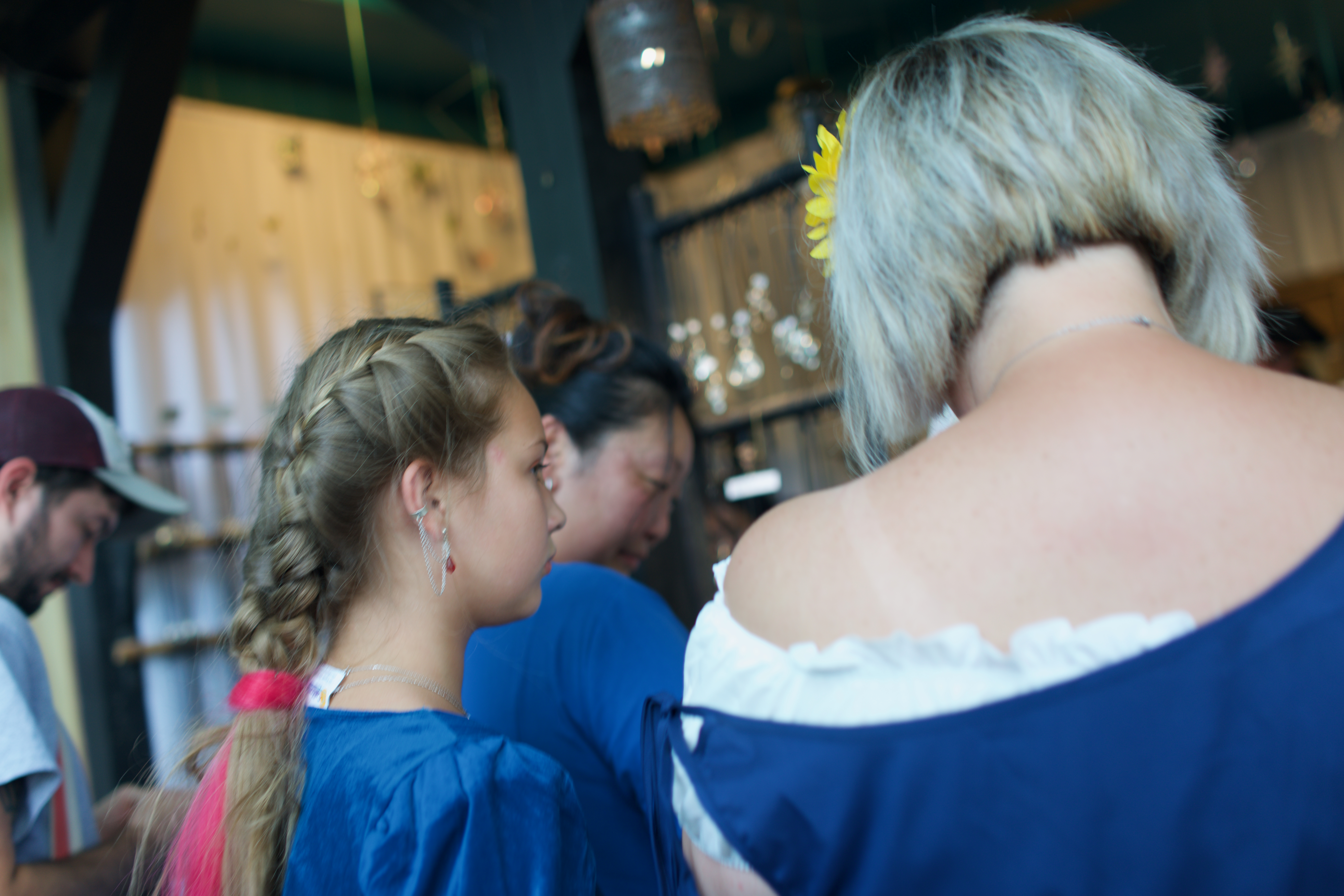 This photograph captures a moment of connection among a group of individuals, with vibrant clothing contrasting against a softly-lit background of trinkets. The mood is intimate and reflective, drawing the viewer into a shared experience. The focus on their backs emphasizes individuality while hinting at a collective celebration.
