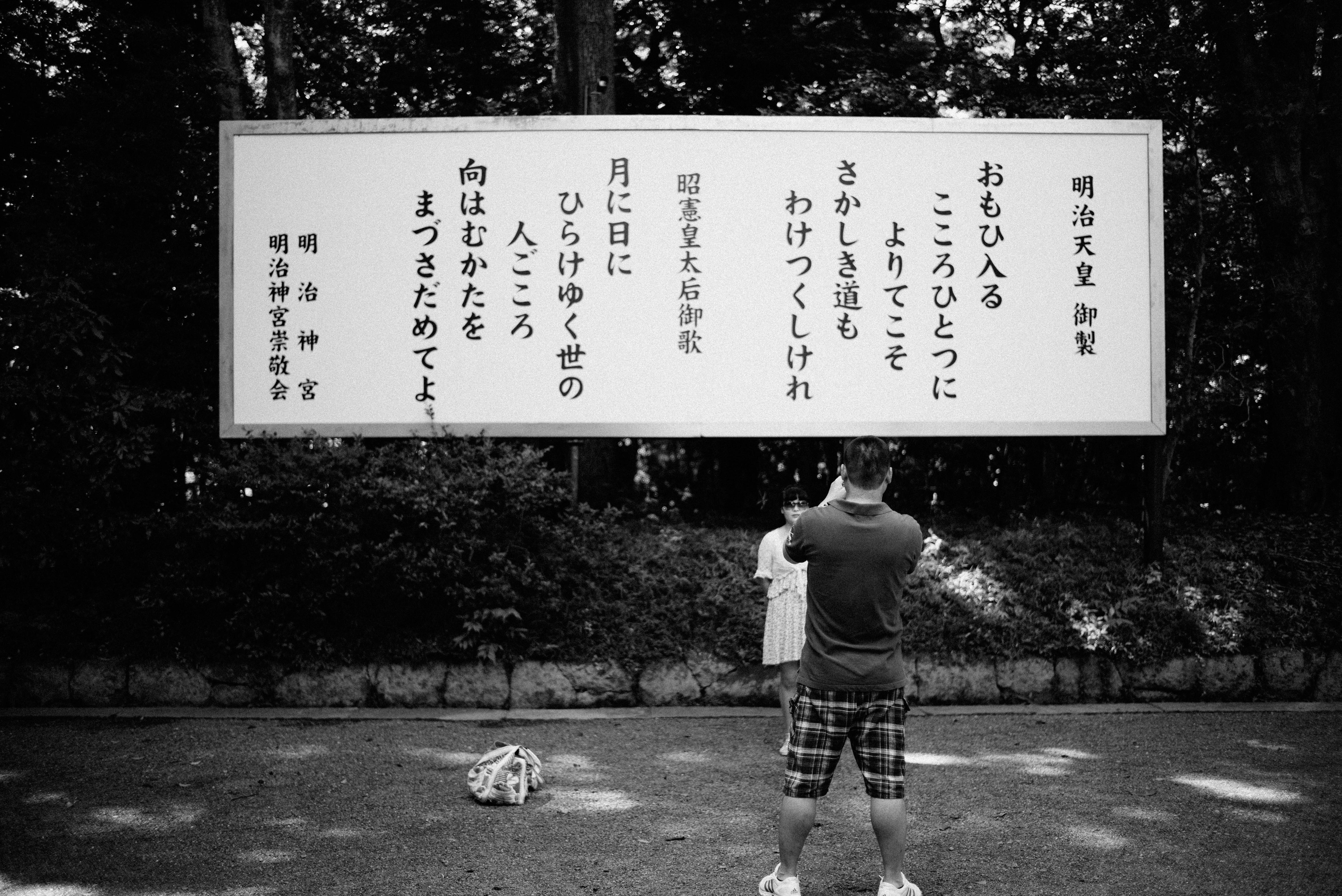 In a tranquil park setting, a man stands captivated by a large sign adorned with poetic text. The soft natural light casts gentle shadows, enhancing the contemplative mood as he engages deeply with the words, seemingly in a moment of reflection. The composition balances the figure and the expansive sign, drawing the viewer’s eye to the intersection of personal experience and collective memory.