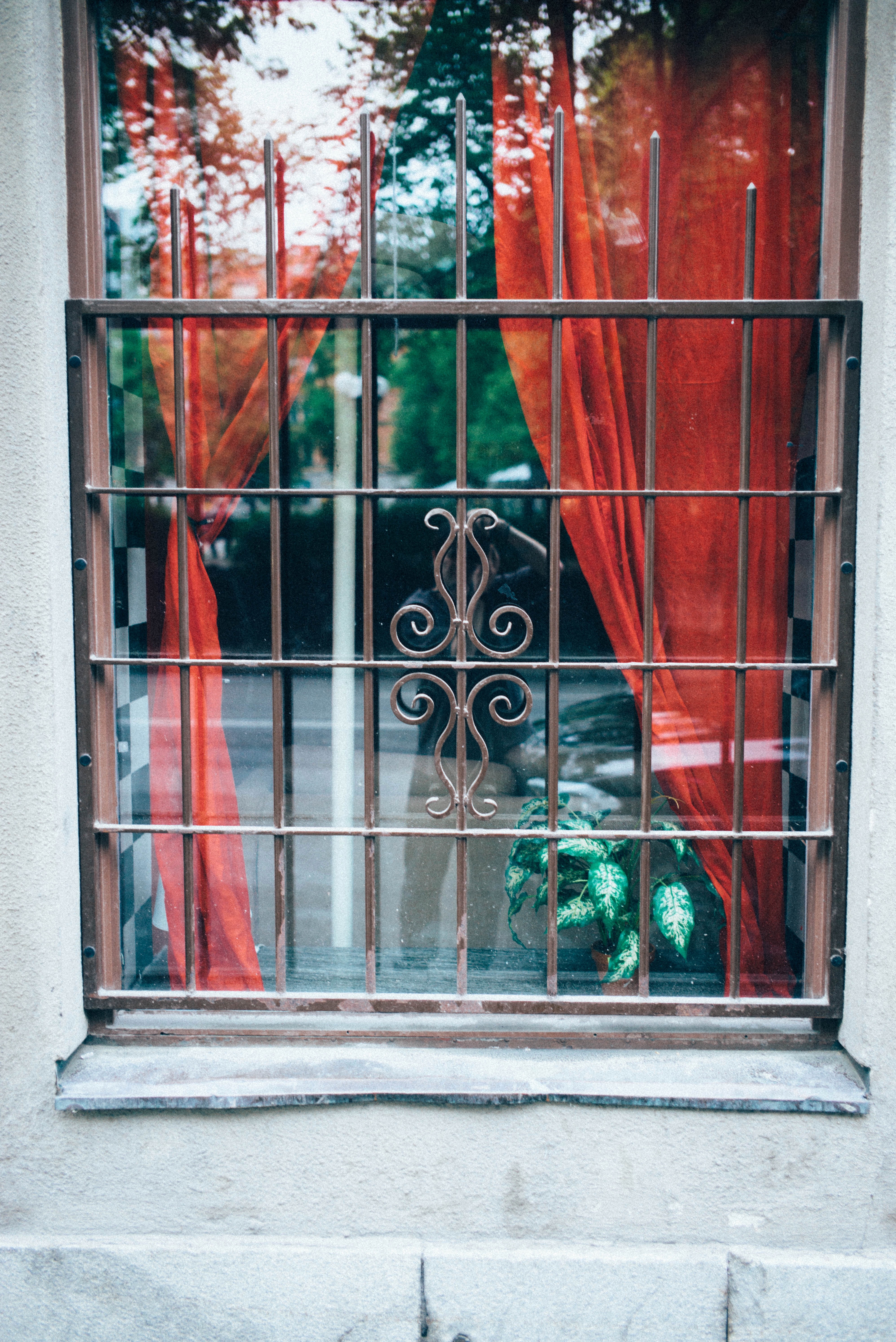 This photograph captures a window adorned with vibrant red curtains, framing a glimpse of a lush green plant within. The interplay of light and reflections evokes a contemplative mood, while the wrought iron bars hint at protection and separation from the outside world. The soft focus on the edges invites a sense of intimacy—both inviting and yet slightly distant.