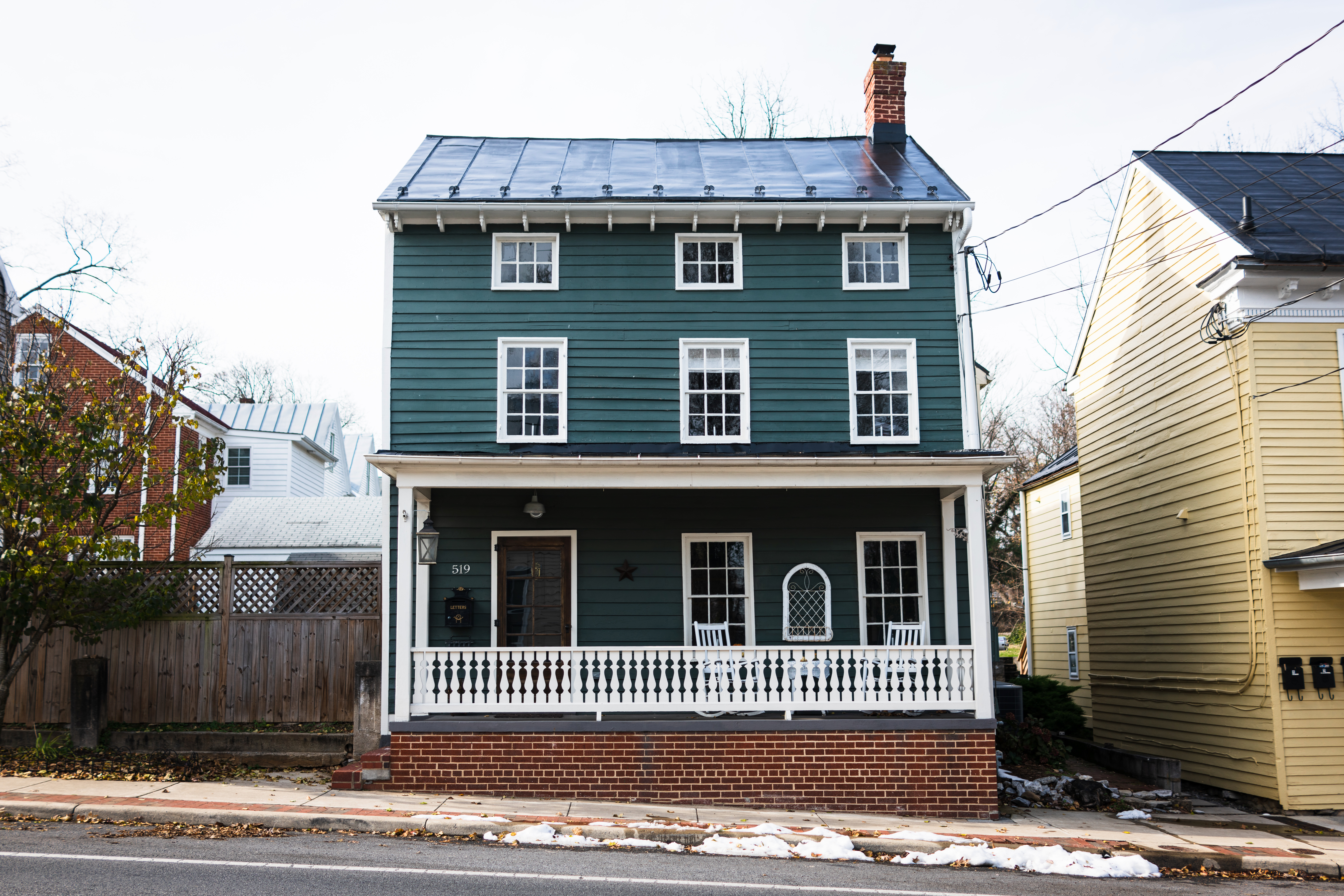 This photograph captures a quaint green historical house, exuding a sense of nostalgia and warmth. The symmetrical composition, framed by neighboring homes, highlights its inviting front porch beneath a bright, sunny sky. Soft natural light enhances the vibrant color of the exterior, creating a cheerful yet somewhat serene atmosphere.