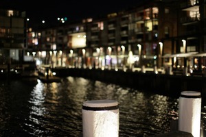 In this evocative night scene, a softly illuminated waterfront is framed by charming buildings, their lights shimmering on the water’s surface. The foreground post, sharply focused, contrasts against the dreamy bokeh of the bustling background, creating a sense of tranquility amid urban life. The cool tones of the night enhance the serene mood, inviting contemplation and peaceful reflection.