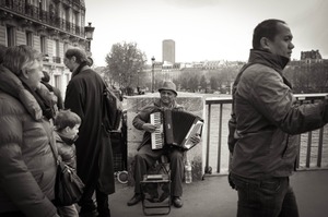 In a bustling Parisian scene, an elderly accordionist plays passionately while surrounded by a diverse group of passersby. The mood is a blend of nostalgia and vibrancy, captured in a monochromatic palette that adds depth and character. Soft, diffused lighting enhances the emotional tone, illuminating the joyful yet contemplative expressions on the faces of both the musician and the engaging crowd.