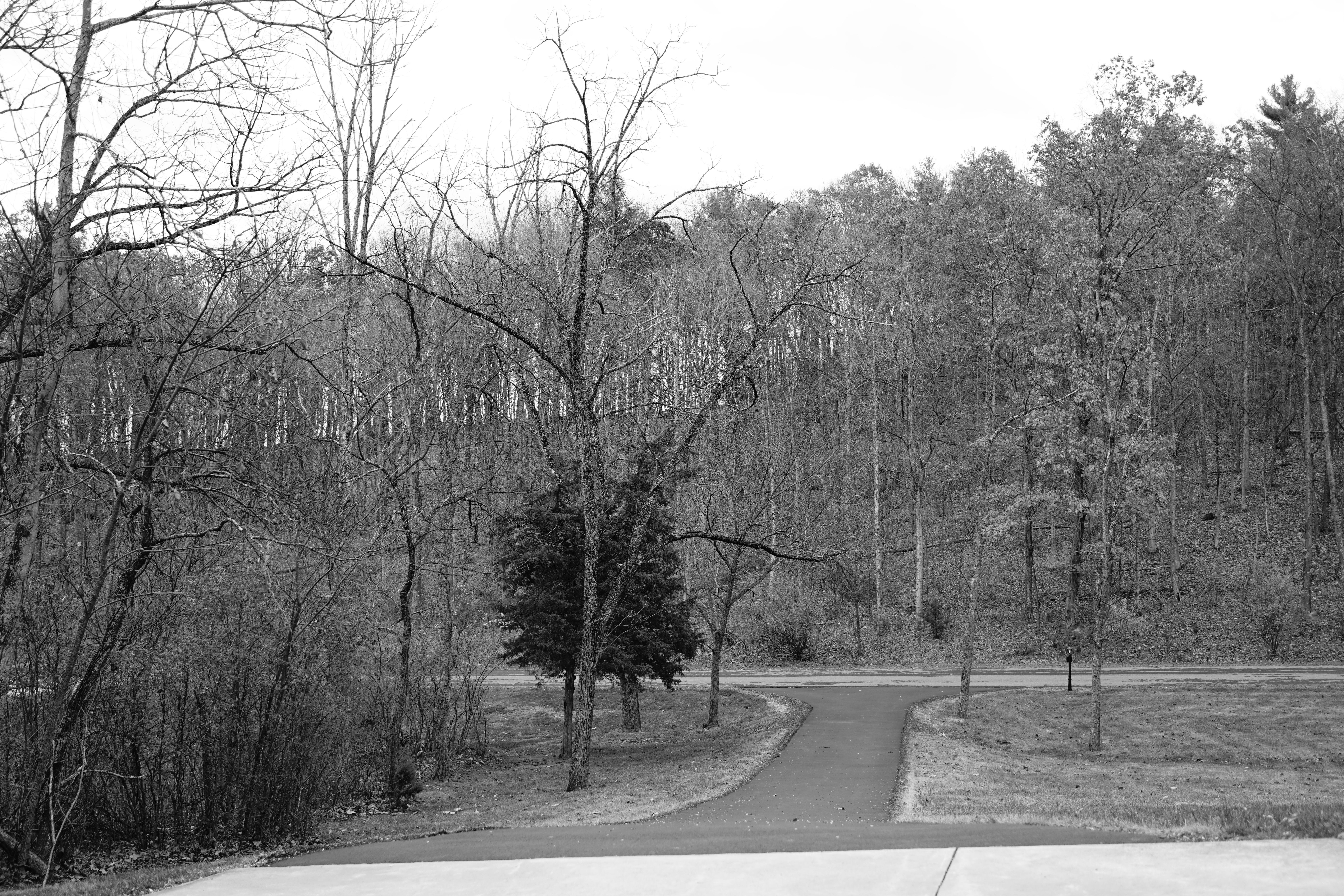 In this serene black-and-white photograph, a winding path leads through a sparsely wooded area, emphasizing the stark beauty of leafless trees against a backdrop of dense forest. The light is soft and muted, evoking a sense of calm and introspection, as the contrasting textures of the branches add depth to the composition. The overall mood is contemplative, inviting viewers to ponder the transition of seasons and the passage of time.