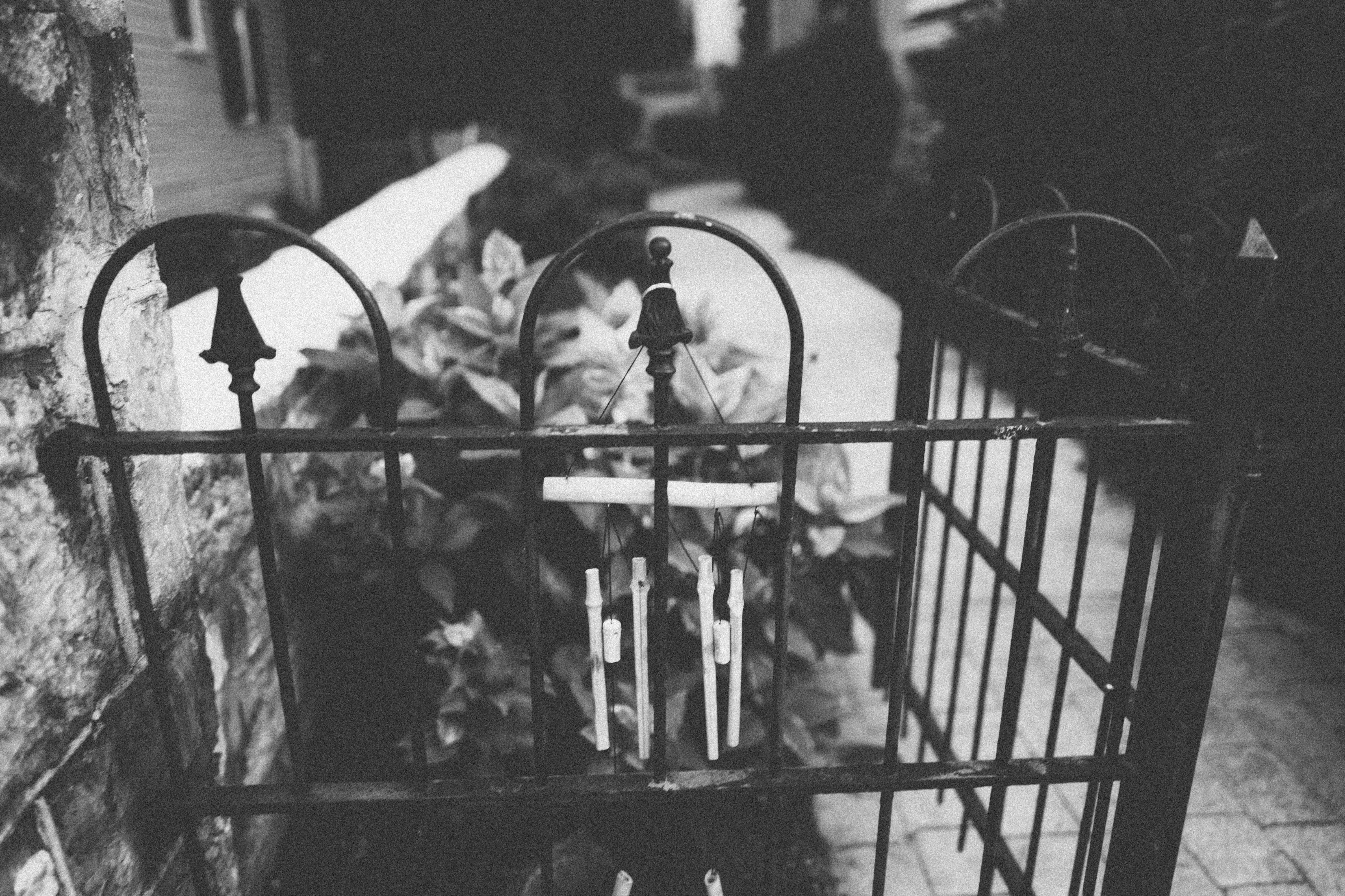 This black-and-white photograph captures a quaint, weathered iron gate, adorned with delicate details and simple wooden clothespins hanging from it. The soft focus and muted tones create a nostalgic atmosphere, evoking a sense of calm and tranquility as the background blurs into a gentle path leading away from the gate. The interplay of shadows and light adds depth, inviting the viewer to ponder the stories held within this serene garden space.