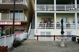 A vibrant seaside scene captures a group of friends lounging on the porch of a beach hotel, dressed in casual summer attire. The playful mood is enhanced by bright colors from the nearby candy shop, while the cloudy sky introduces a hint of melancholy. The composition invites viewers to reflect on the joy of leisure and community amidst a tranquil coastal backdrop.