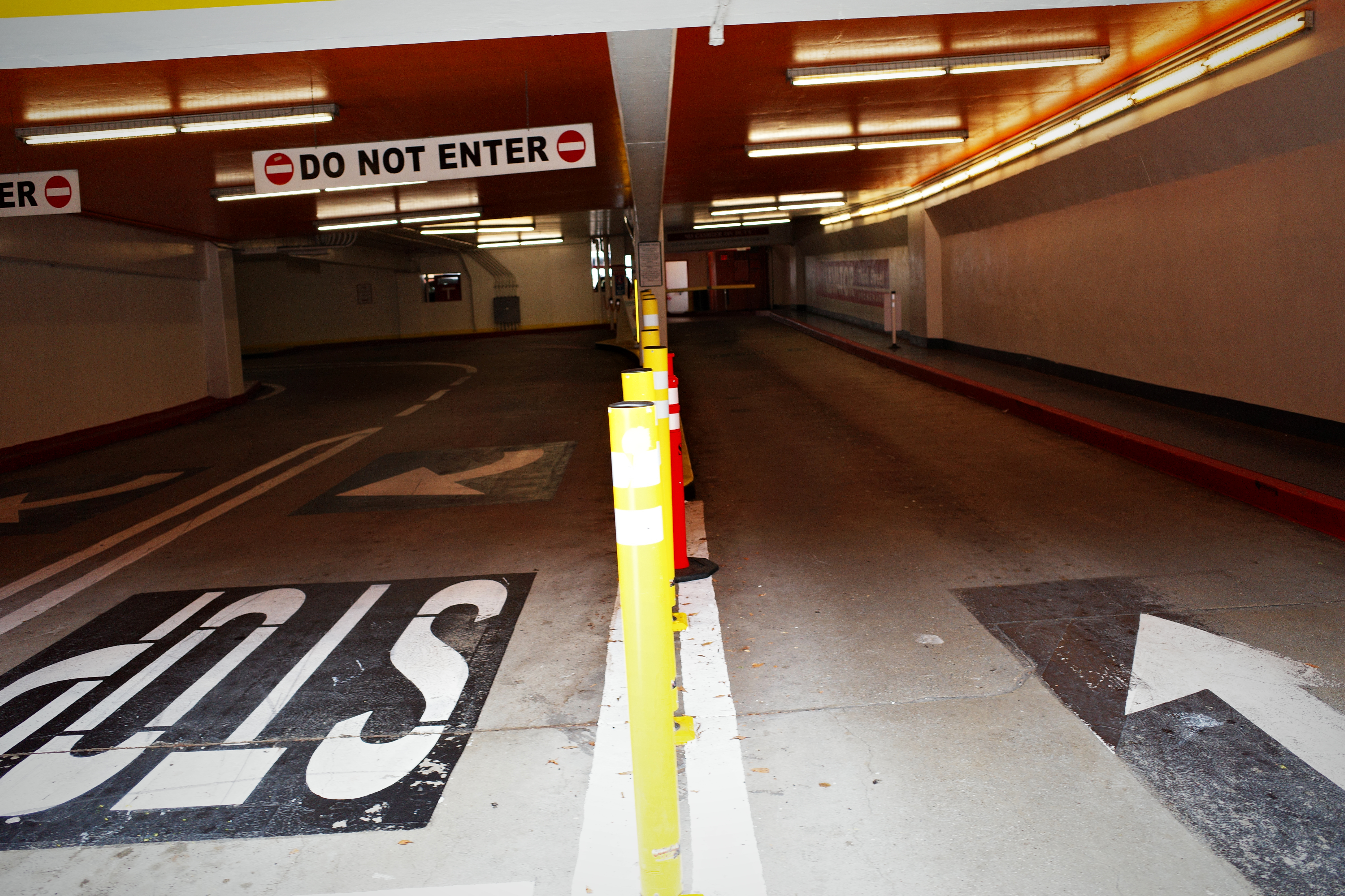 The photograph captures an empty parking garage, evoking a sense of isolation and stillness. Harsh fluorescent lights illuminate the stark, minimalist environment, while bold markings on the ground guide the viewer's eye toward the ominous 'DO NOT ENTER' signs. The composition, with its angular lines and muted colors, creates a slightly unsettling yet intriguing atmosphere, inviting contemplation of the often-overlooked spaces within urban life.
