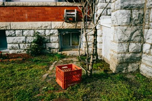 In an urban setting, a vibrant orange crate sits alone on the lawn, contrasting sharply with the muted tones of the surrounding brick and stone. The sunlight casts gentle shadows, enhancing the textures of the weathered stone wall and the freshly green grass beneath. The composition evokes a sense of stillness, inviting contemplation of the simplicity and beauty found in everyday details.