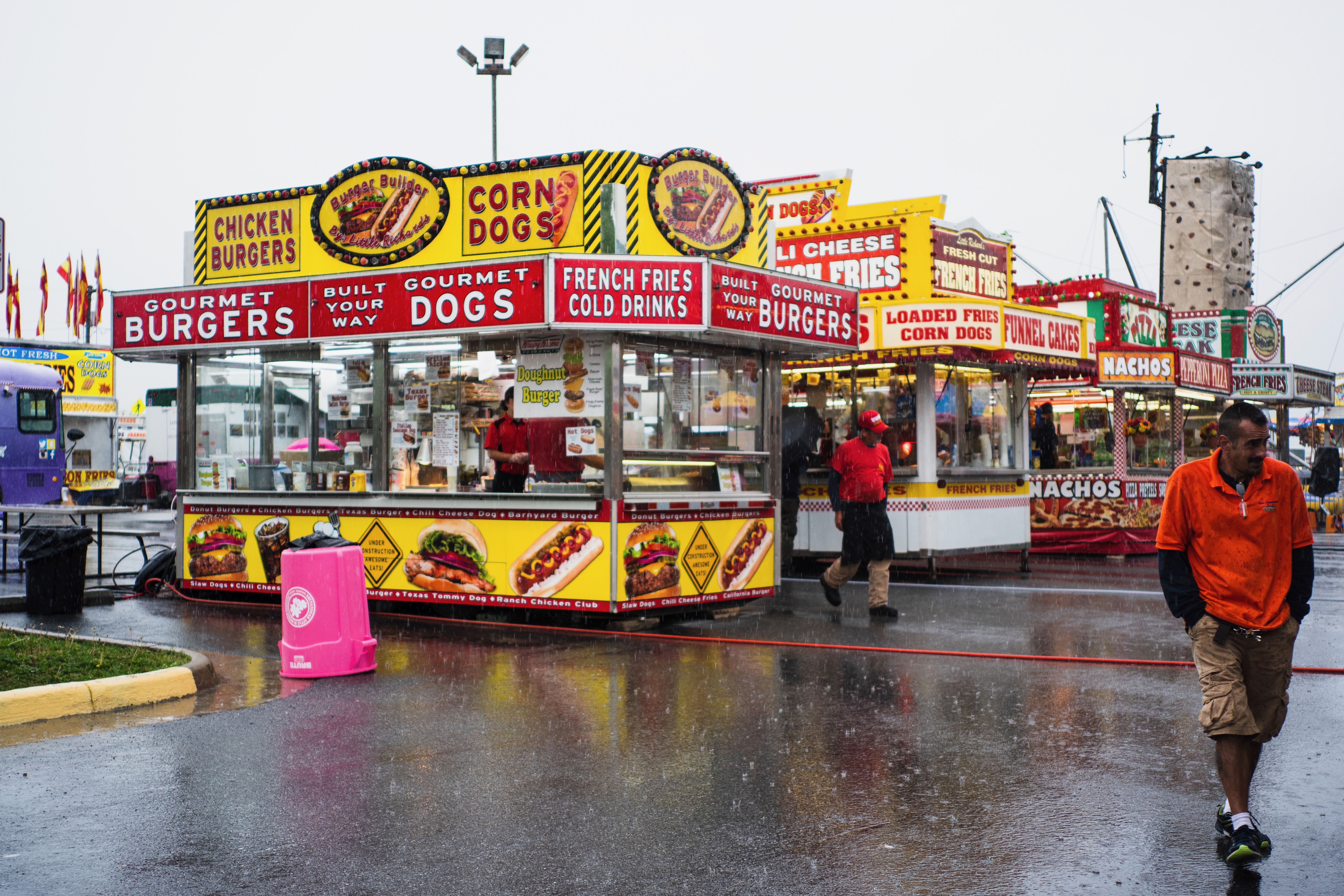 The photograph captures a bustling fairground scene under the rain, with vibrant food stalls showcasing their colorful signage for gourmet burgers and corn dogs. The wet pavement reflects the bright colors, adding to the lively atmosphere despite the gloomy weather. A lone figure strolls by, embodying a sense of casual resilience amidst the festivities.