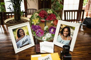 The photograph captures a warm, intimate setting featuring two framed portraits of young women, prominently displayed among a vibrant floral plate and scattered keepsakes. Soft natural light filters in, enhancing the cozy atmosphere while emphasizing the connection between the subjects and their surroundings. The wooden table adds a rustic charm, inviting a sense of nostalgia and familial bonds.