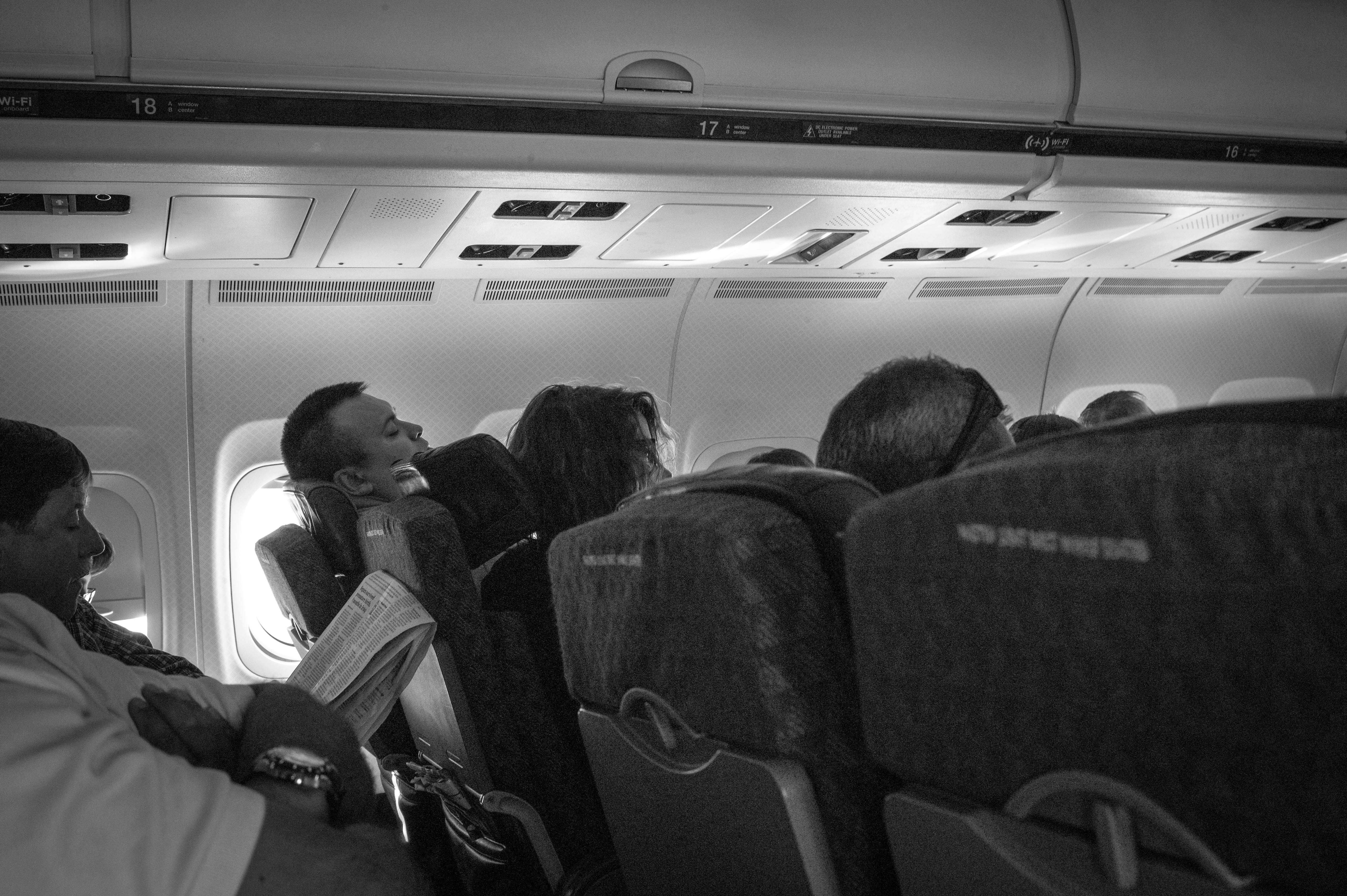 This black-and-white photograph captures a moment within an airplane cabin, focusing on travelers in quiet repose. The diffused lighting highlights their expressions, evoking a sense of introspection and shared solitude amidst a crowded space. The composition draws the viewer's eye across the row of seats, creating a juxtaposition of comfort and confinement.