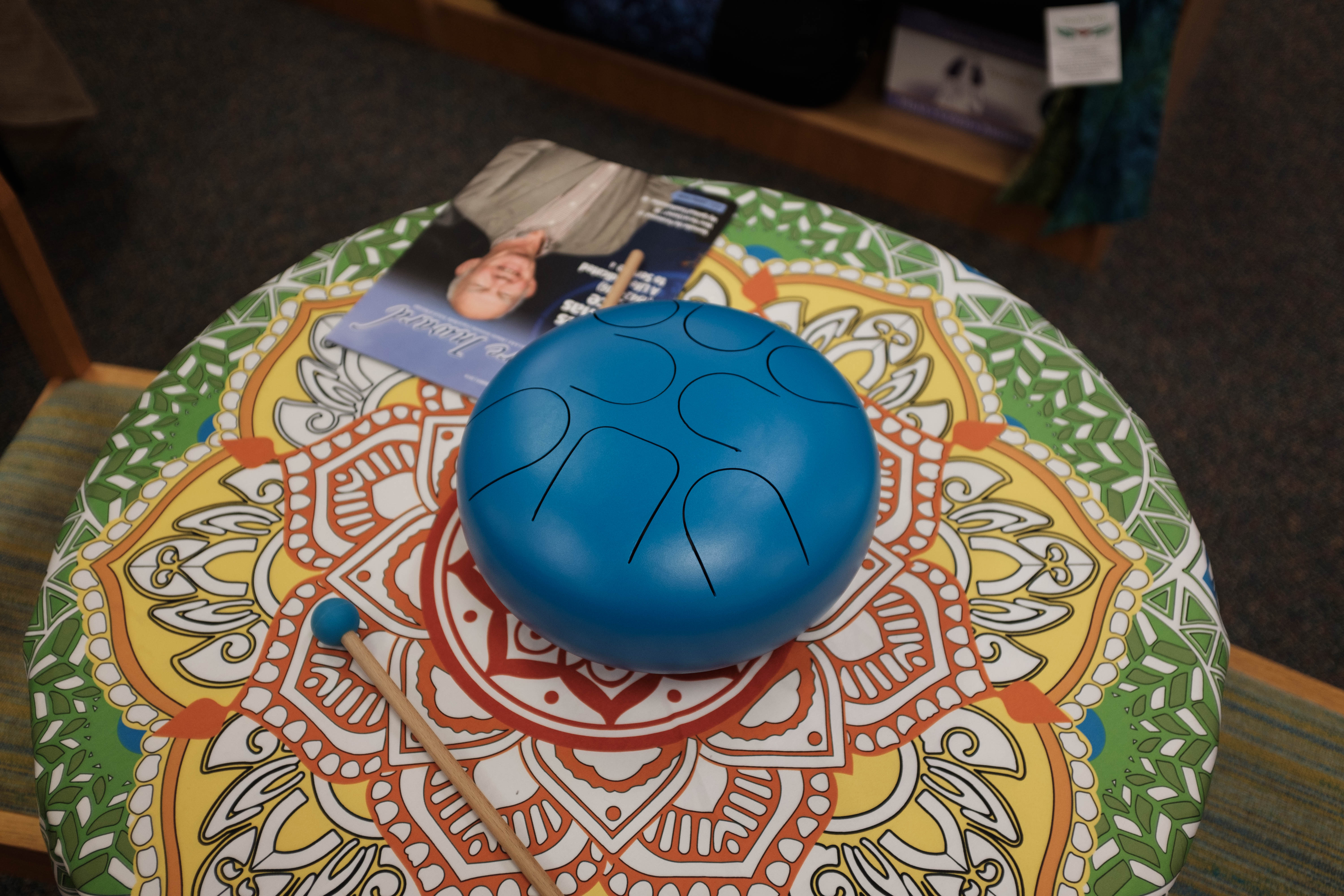 A vibrant blue handpan rests gracefully on a colorful mandala-patterned table, inviting contemplation and creativity. Soft lighting envelops the scene, enhancing the tranquil mood and highlighting the artistic details of both the instrument and its colorful backdrop. Nearby, a magazine lies open, suggesting a moment of pause in a cozy, inviting space.