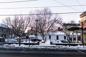 In this serene winter scene, bare trees stand against a pale sky tinted with soft hues of dawn, creating a tranquil mood. Snow blankets the ground, highlighting the quiet of the deserted street and the gentle light from nearby lamps. The composition draws the eye through the sparse landscape, evoking a sense of peaceful solitude.
