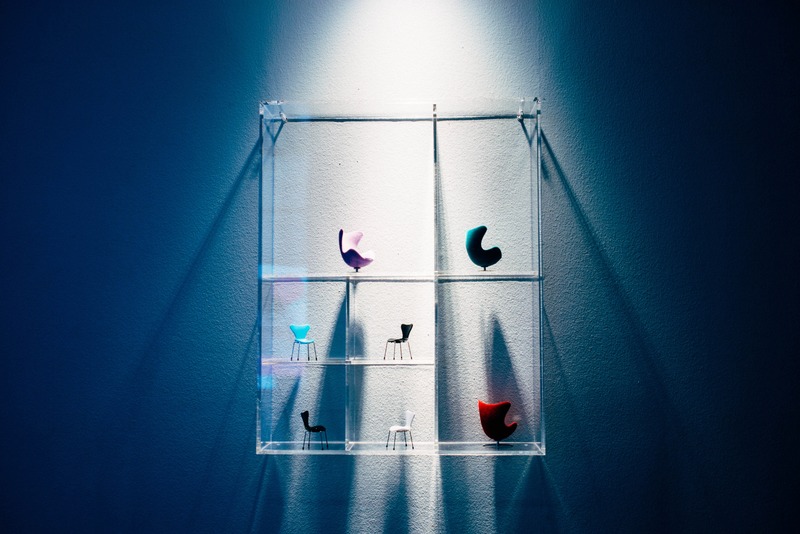A minimalist display showcases colorful miniature chairs, each uniquely designed, mounted within a clear acrylic shelf. The moody blue lighting casts elongated shadows that create a sense of depth and intrigue, accentuating the playful yet elegant arrangement of the pieces. The simplicity of the composition highlights the artistic qualities of the chairs, inviting contemplation.