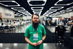 The photograph captures a thoughtful speaker amidst a bustling conference scene. He stands confidently in the foreground, wearing a vibrant green shirt that contrasts with the muted backdrop of attendees engaged in discussions. The lighting creates a soft glow that highlights his demeanor, adding a sense of warmth to the professional environment.