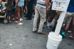 The photograph captures a vibrant street scene filled with people, emphasizing a sense of community and bustling energy. Various legs and feet are visible, suggesting movement and interaction, against a backdrop of muted gray pavement. Soft, diffuse lighting enhances the casual, summery mood, inviting viewers to feel the warmth and vibrancy of the gathering.