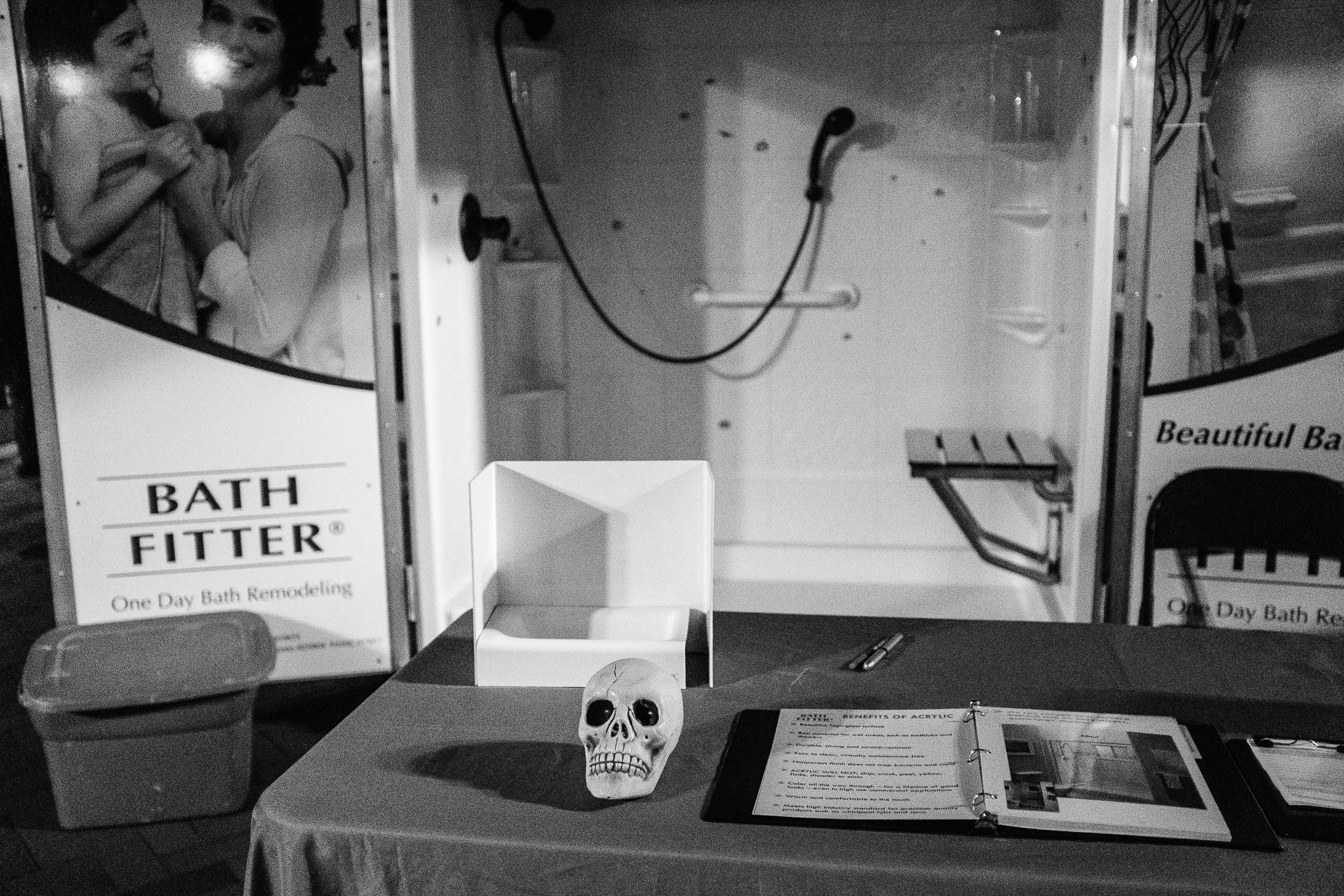 In this dimly lit scene, a stark white skull perches on a table, contrasting unnervingly with the backdrop of a bath remodeling advertisement. The chilling mood is heightened by the shadows, while the bright lights of the bathroom display create a juxtaposition between the mundane and the macabre. This unsettling composition evokes curiosity and a sense of the surreal, inviting viewers to ponder the relationship between life and home improvement.