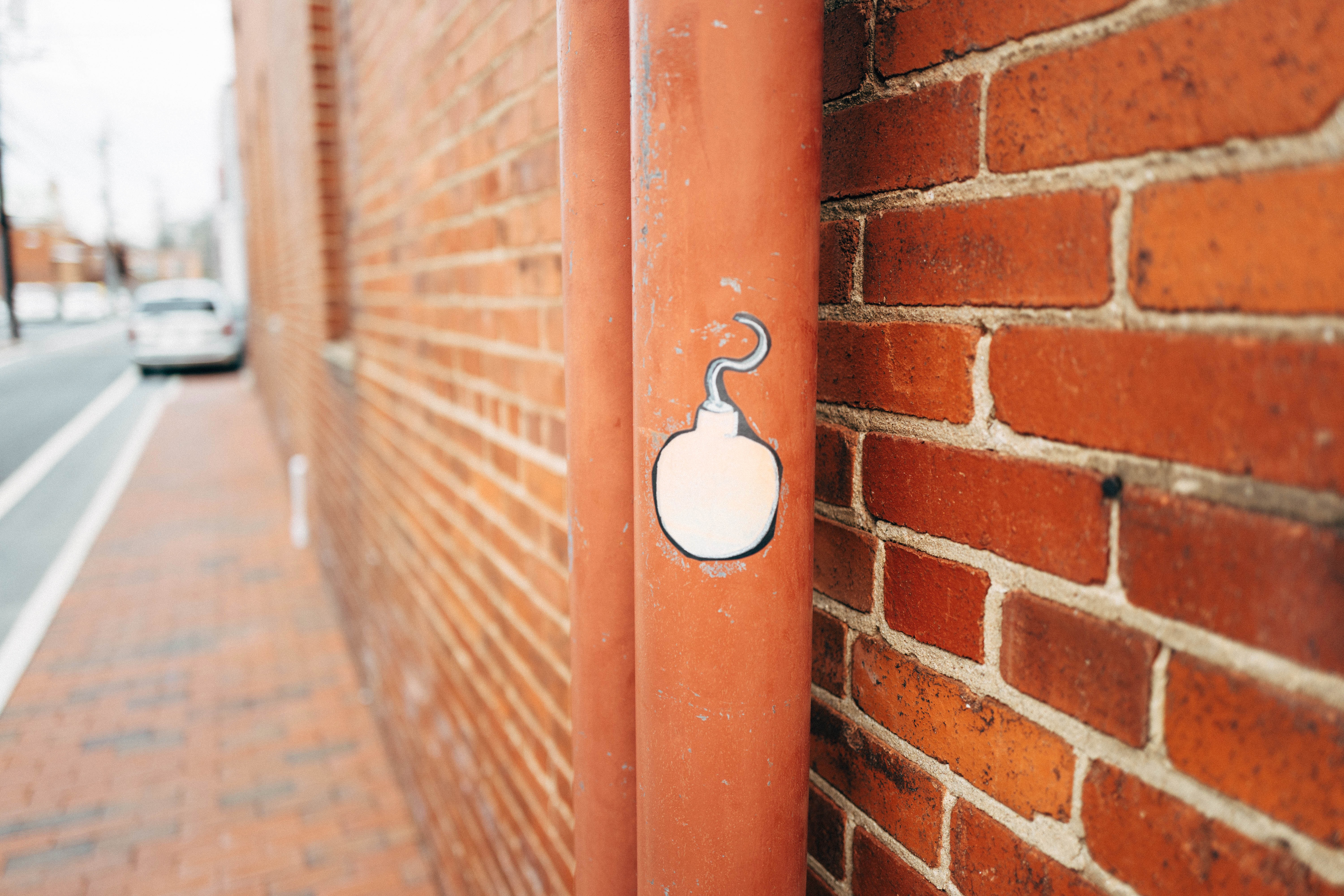 The photograph captures a whimsical sticker of a bomb on a rusty pipe against a backdrop of textured brick walls. The warm tones of the bricks create a cozy yet contrasting mood against the humorous symbol, inviting curiosity and a chuckle. Soft daylight bathes the scene, enhancing the intricate details of the wall and the playful juxtaposition of graffiti and industrial elements.