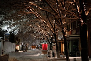 The photograph captures a serene winter street, draped in a fresh layer of snow and illuminated by delicate fairy lights woven through bare branches. A soft glow emanates from nearby storefronts, contrasting with the tranquil, moonlit ambiance, evoking a sense of calm and nostalgia. The composition draws the eye down a snow-covered path, inviting viewers to wander into this winter wonderland.