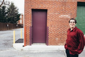 A young man stands casually against a backdrop of textured brickwork, wearing a vibrant red shirt that contrasts with the muted tones of the environment. His smile brings warmth to the scene, while the dimly lit alley and rugged surroundings suggest a laid-back urban vibe. The composition, with the purple door framed to one side, adds an intriguing element to the portrait.