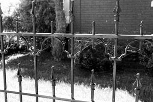 A wrought iron fence looms in soft focus, adorned with delicate cobwebs that hint at neglect and passage. The stark contrast of black and white emphasizes the textures, while dappled light casts gentle shadows on the grass, creating a melancholic yet serene atmosphere. This composition invites contemplation on abandonment and the beauty found in decay.