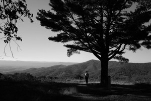 A solitary figure stands beneath a towering pine tree, gazing out at the expansive mountainous landscape. The black-and-white composition enhances the mood of tranquility and contemplation, while the play of light and shadow adds depth to the scene. The serene backdrop of rolling hills evokes a sense of peace and introspection, inviting the viewer to reflect on the beauty of solitude in nature.