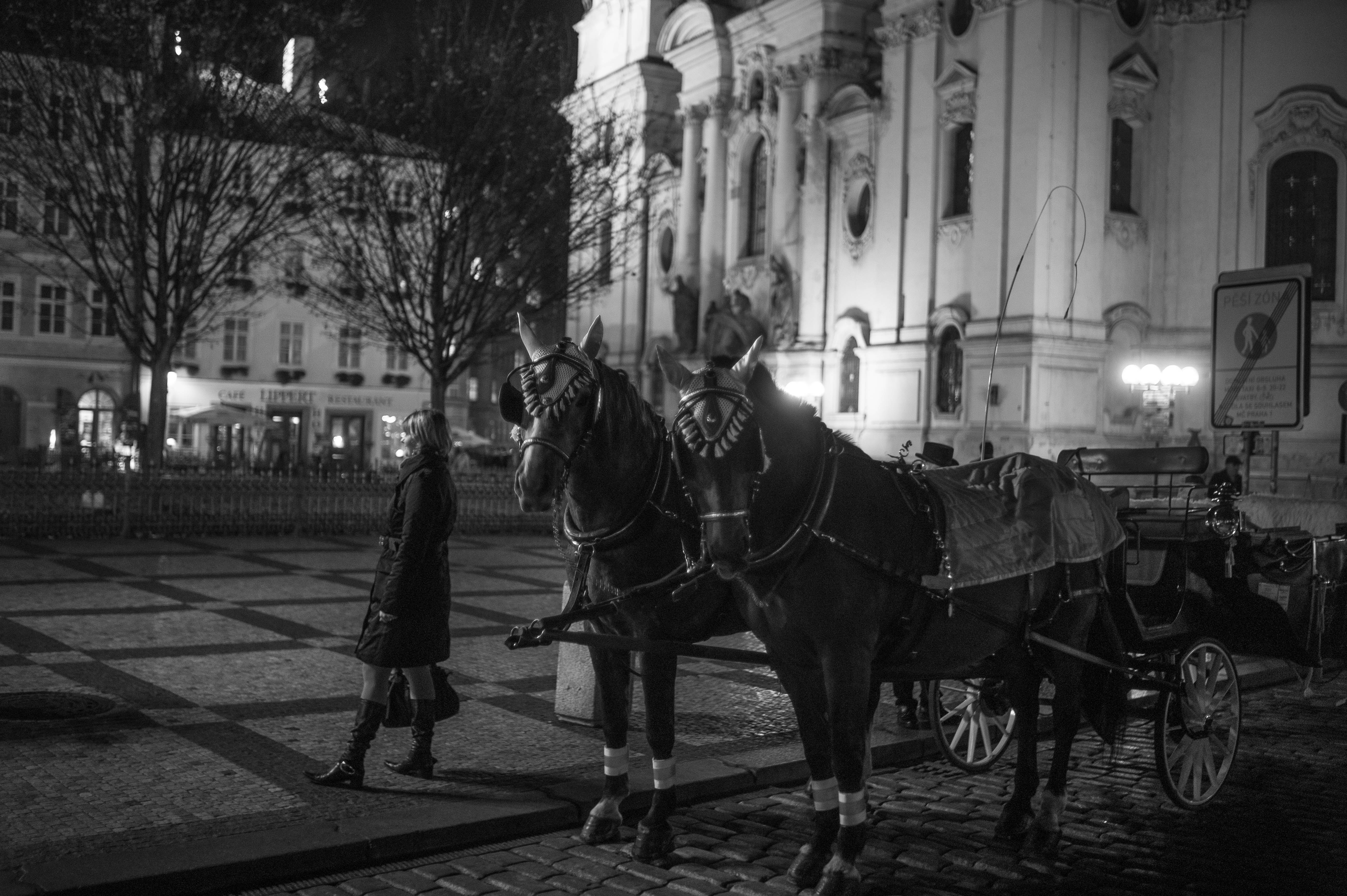 In this moody black-and-white photograph, a woman stands beside two elegantly adorned horses, creating a sense of intimacy amid the nighttime ambiance. The soft glow of nearby streetlights contrasts with the stark shadows, accentuating the intricate architecture in the background. The composition evokes a timeless charm, blending human and equine presence in a serene urban setting.