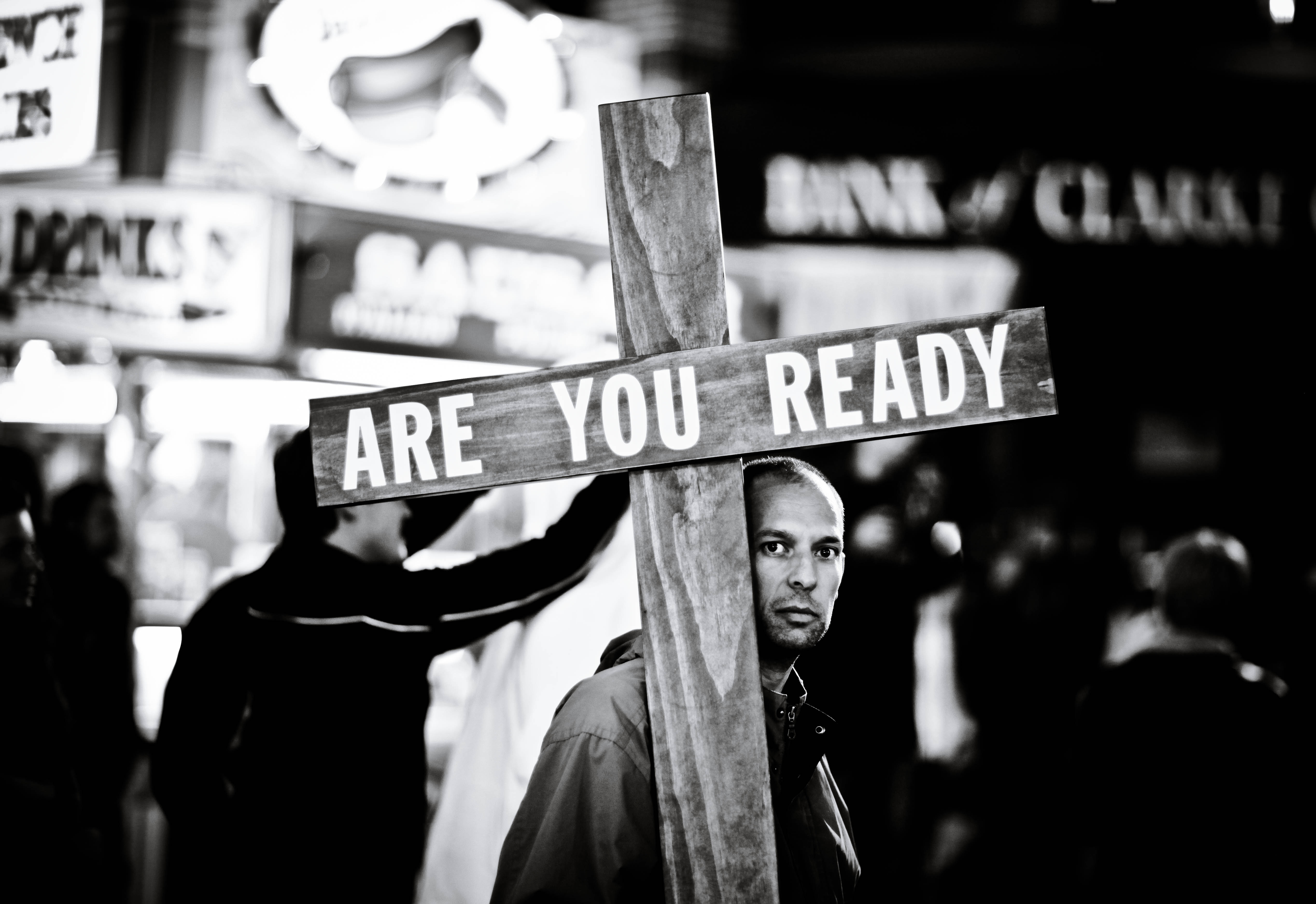 In a bustling urban setting, a man stands quietly holding a large cross with the words 'ARE YOU READY' prominently displayed. The monochrome palette enhances the starkness of his expression, evoking a mood of introspection amidst the chaos of the city life around him. The composition frames him against a blurred backdrop of passersby, highlighting his solitary presence and the weight of his message.