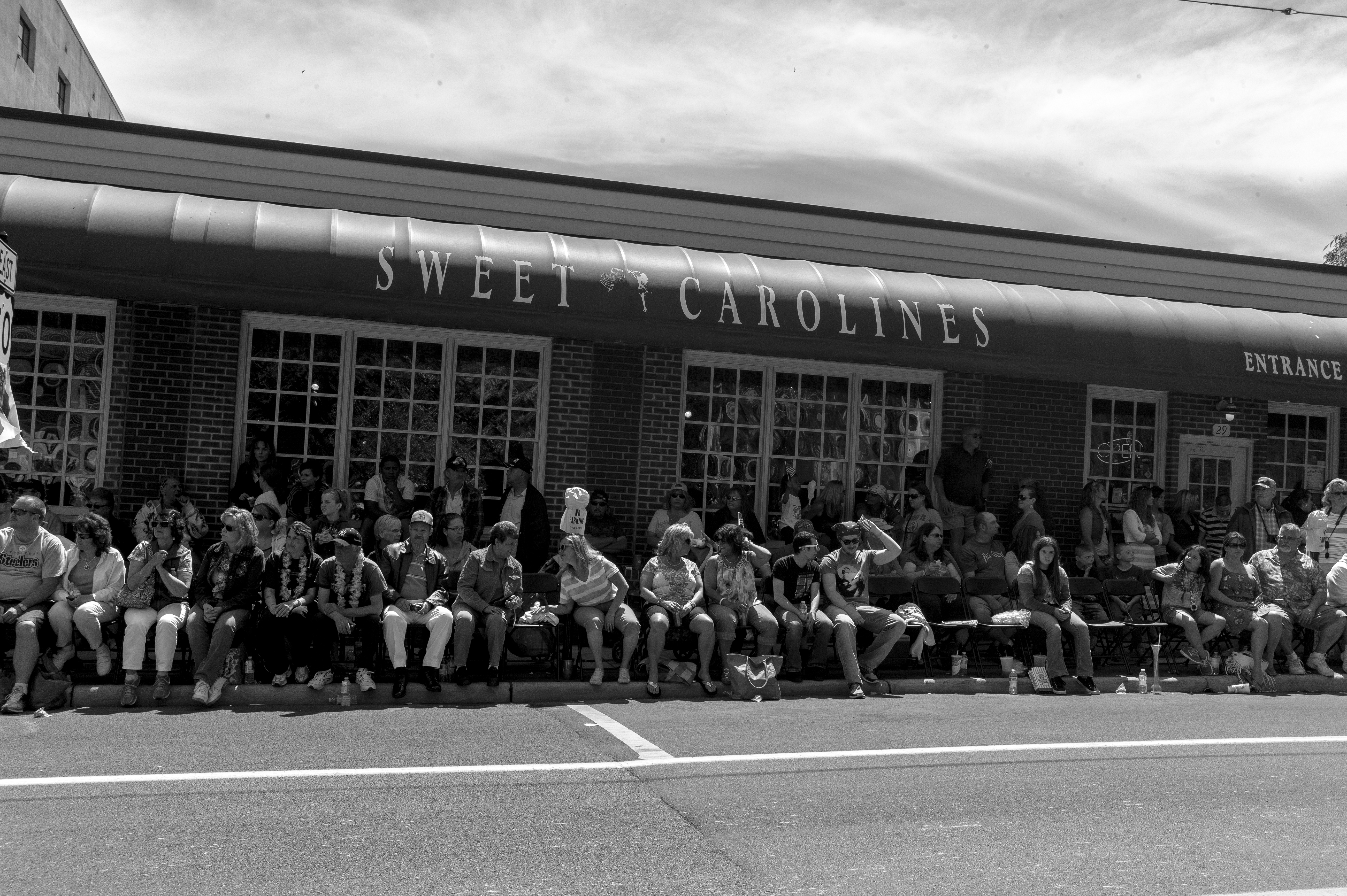 In a monochromatic scene, a diverse group of onlookers sits patiently in front of 'Sweet Carolines,' their expressions ranging from excitement to boredom. The composition captures a moment of communal anticipation, framed by the inviting storefront and a bright sky above. The subdued lighting enhances the nostalgic mood, emphasizing the timeless nature of such gatherings.
