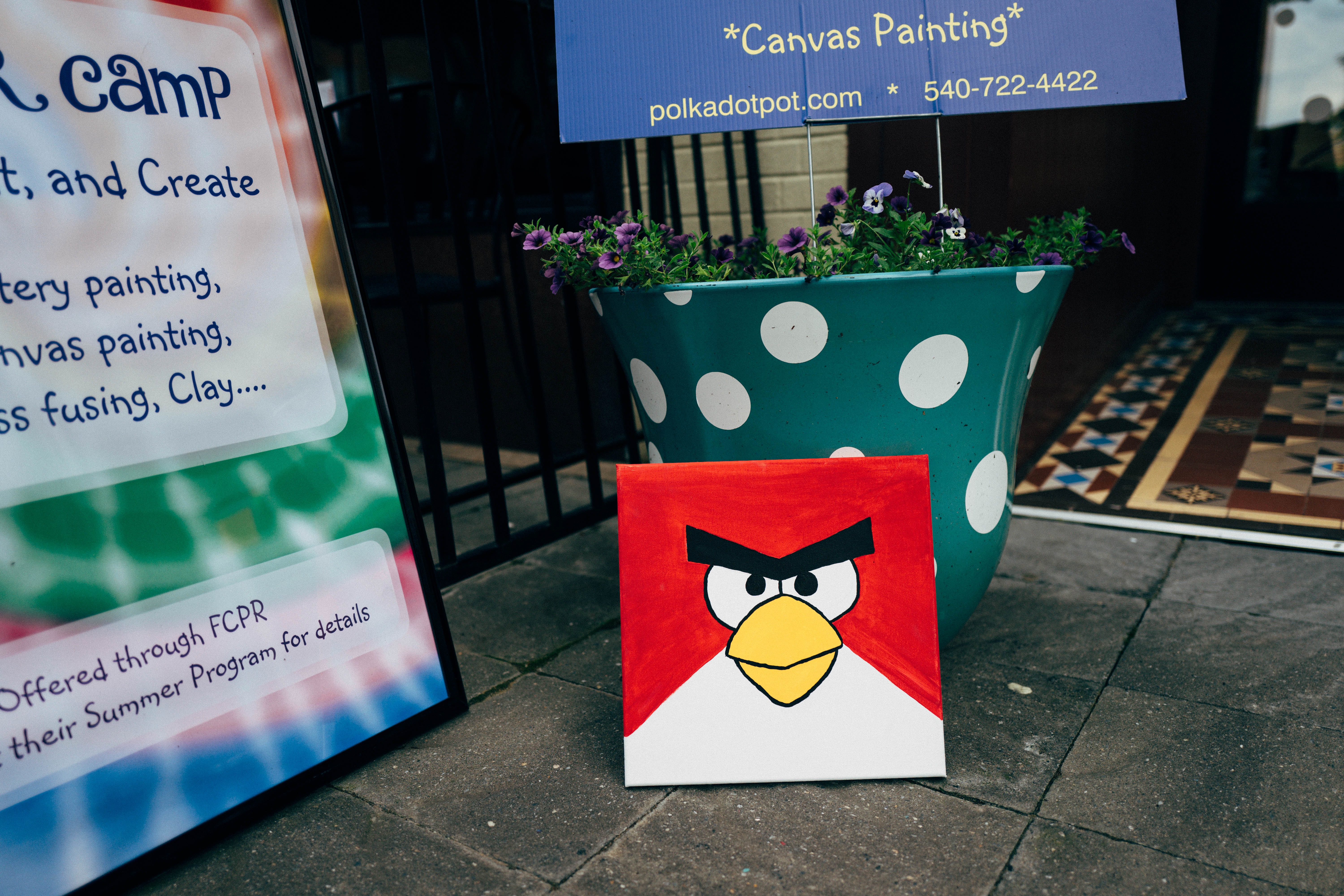 In this lively scene, a colorful canvas painting featuring a cartoon bird is displayed prominently against a backdrop of playful signage and a bright flowerpot. The mood is cheerful and inviting, capturing the essence of artistic exploration, while the natural light enhances the vibrant colors of the artwork and surroundings. The composition balances the painted canvas with soft floral elements, creating an engaging visual harmony.