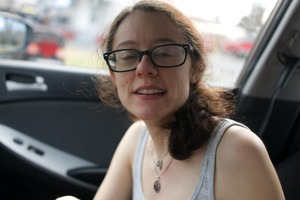 The photograph captures a young woman seated in a car, her expression displaying a mix of relaxed familiarity and gentle curiosity. Soft, diffused lighting from outside illuminates her features, enhancing the warmth of the moment while creating a serene atmosphere. The slightly blurred background hints at an everyday setting, emphasizing the intimate frame around her charming presence.