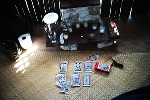 The photograph captures a serene indoor space with a laid-back, bohemian vibe, highlighted by the scattered tarot cards on the woven mat. Soft, dappled light filters through wooden slats, casting gentle shadows and creating an atmosphere of reflection and mystery. The minimalist composition draws the eye toward the central altar-like table adorned with candles, connecting the viewer to a moment of contemplation and potential insight.