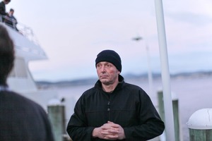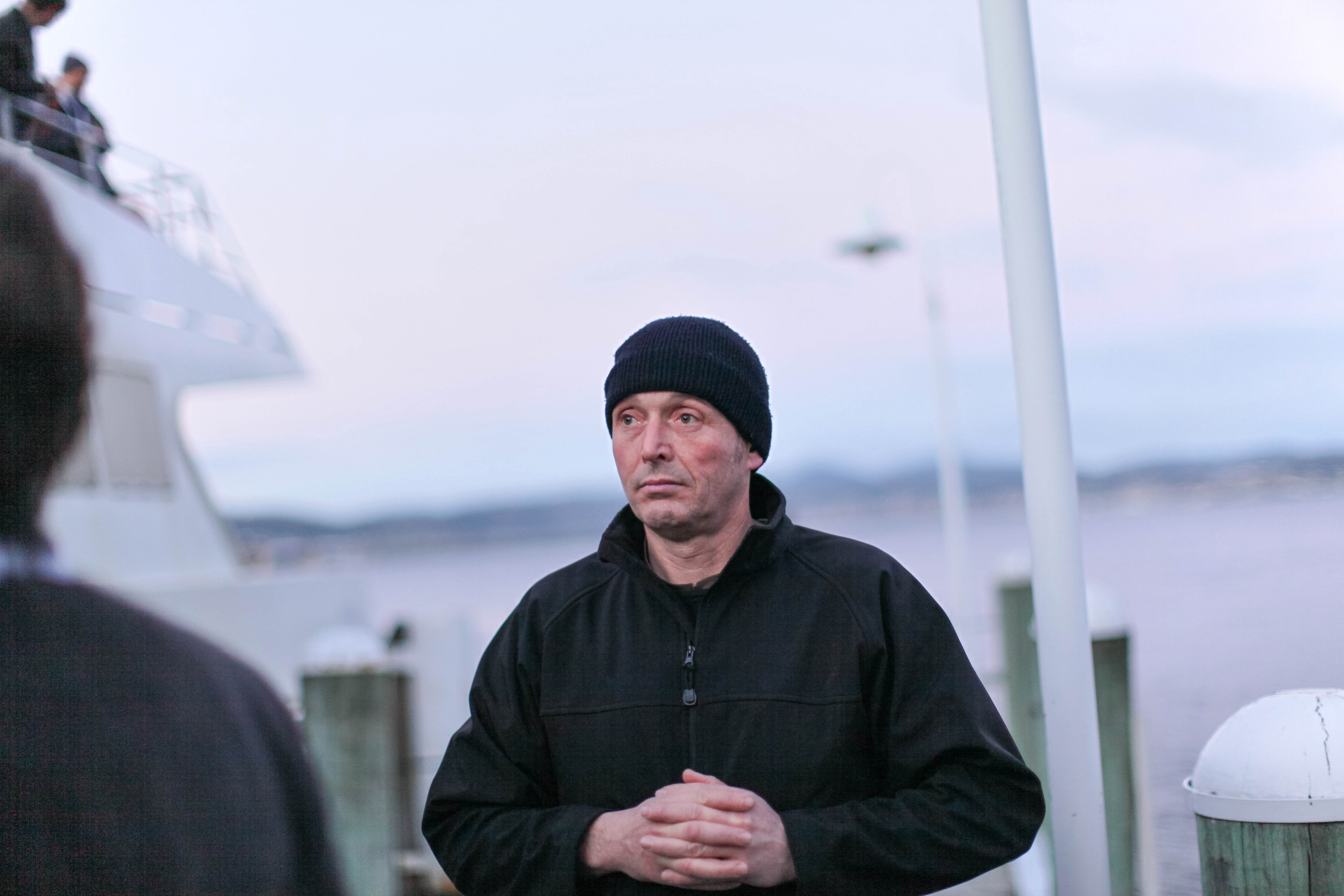 The photograph captures a man in a black beanie and jacket, standing pensively at a dock with a blurry background of silhouettes and soft waters. The muted lighting and pastel sky create a somber mood, emphasizing the subject's introspective demeanor as he gazes into the distance, hands clasped thoughtfully. This composition draws the viewer into a moment of contemplation against the tranquil backdrop of the harbor.