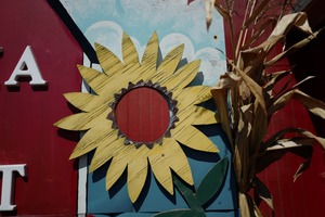 A vibrant wooden sunflower adds a bright focal point against a contrasting red backdrop, evoking a cheerful, rustic atmosphere. The sunlight casts a warm glow, enhancing the colors and textures, while dried corn stalks frame the scene, hinting at the harvest season. The playful cut-out center invites curiosity, making this charming composition feel both inviting and seasonal.