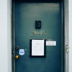 The weathered teal door, marked with the number '411A', stands resilient against a softly illuminated background, creating an air of intrigue. Notices fluttering near the door hint at a quiet activity within, while the broken doorbell evokes a sense of neglect and mystery. The composition invites exploration, contrasting the sturdy metal against the pale surrounding wall.
