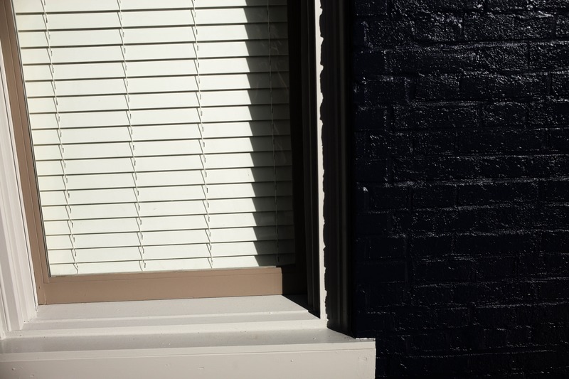 This photograph captures a window framed against a stark dark wall, highlighting the interplay between light and shadow. The slatted blinds cast linear shadows, creating a rhythmic texture that contrasts with the smoothness of the adjacent brick. The mood is both serene and contemplative, evoking a sense of quiet introspection.